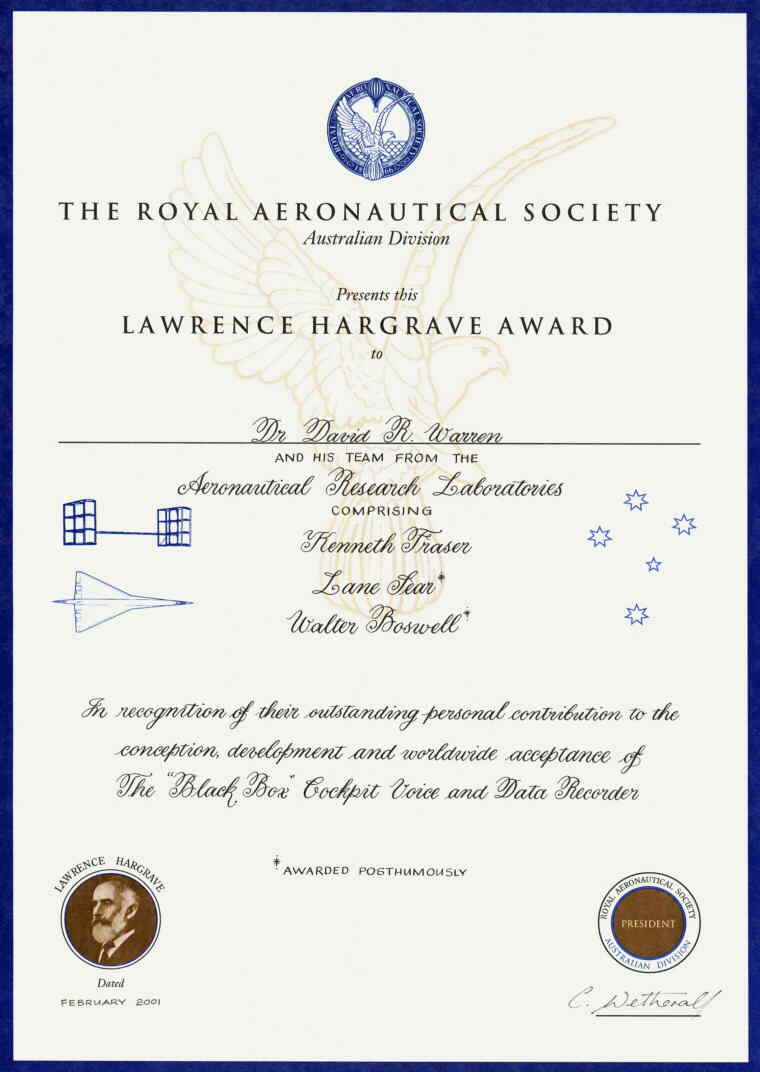 The Mk 2 pre-production prototype was installed in the Department of Civil Aviation Fokker Friendship aircraft, VH-CAV, and the test flight took place on 23 March 1962 departing from Essendon airport (in Melbourne, Australia). Recording and recovery of cockpit voice and flight data were 100% successful. It was my first flight test and I was aged 24 at the time. While no tests were performed on a deployable unit the idea was in the forefront of those being investigated by Dr Warren. A detachable recording medium within a foam plastic aerofoil and fitted with a radio beacon transmitter was one such possibility under review. It was based on a type that had been developed by the National Research Council of Canada. More details are provided in the 1962 Ref. 4 film. No work was included on underwater or over-land crash locator beacons that are standard for current-day passenger aircraft. The over-land locator beacons are not part of the black box units. At the time of the 1962 flight ARL was part of the Department of Supply, not the Department of Defence as became the case later. And so it was that we captured that small window where we could be involved with civil aircraft. Without that window I believe we would not have had the opportunity to pursue such a venture. A major limitation of the use of magnetic wire was that, unlike magnetic tape, it was essentially a single recording track medium. That meant that the audio and flight data channels needed to be restricted to separate frequency bands. The flight data were time multiplexed and used a pseudo-digital recording technique. Graphical plots of the recovered data from the 1962 concept validation flight are included in the column of images on the right. Best flight parameter accuracy was achieved when the Ground Station was connected to an external electronic counter (and an associated digital printer if a permanent record were required). A photograph of the intense fire test performed at ARL, also in 1962, of the recording within the fireproof enclosure is also included in the column of images on the right. In 1963 in anticipation of the coming British Ministry of Aviation (MOA) accident recording mandatory requirement, the British firm S. Davall & Son approached ARL for the production rights for the ARL system. In August 1963, Davall who had hopes of gaining a contract to produce a system based on the ARL Flight Memory Cockpit Voice and Data recording and recovery system, requested ARL that I be seconded for assistance with their development based on the ARL system. Subsequently the MOA announced a requirement for airliners to fit an FDR but a CDR was omitted in this initial requirement. British European Airways (BEA) contracted Davall to make the recorder but the electronics contract went to Plessey. With these developments Davall no longer required my secondment. The Davall "Red Egg" accident recorder, based on the ARL system, used magnetic wire as the recording medium, and was in production over the 1968 to 1978 period. It won a large part of the British and overseas market at that time. Cockpit voice recording did not become mandatory in England until after the "Staines disaster" on 18 June 1972 when BEA Flight 548, on a scheduled passenger flight from London Heathrow airport to Brussels, crashed soon after take-off, killing all 118 people on board. As of 2023, it remains the deadliest air accident in England. For the United Kingdom the Lockerbie air disaster in Scotland in 1988, as a result of a terrorist bomb, was ever more deadly than the Staines disaster. The ARL system was never patented and never went into production either in Australia or overseas. When built it was ahead of its time. Prior to the 60th anniversary of the ARL/DSTO Melbourne laboratory in 1999 Dr Warren and I wrote a summary of the ARL Black Box history with the pre-1961 aspects being totally attributable to Dr Warren. This document (Ref. 5) reveals the difficulties presented with convincing people that the black box idea was worth pursuing. Doubters were plentiful. This document provides an authentic summary information on the ARL Black Box. Dr Warren, together with the team involved in the pre-production prototype development, were recognized in the Lawrence Hargrave Award granted by the Australian Division of The Royal Aeronautical Society in February 2001 (almost 40 years after the successful flight demonstration occurred). The award was presented by The Hon John Anderson MP, who was the Australian Minister for Transport at the time. A photograph of the award is included in the column of images on the right. Apart from the Lawrence Hargrave Award mentioned above, Dr Warren has received a number of honours: